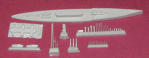 The instructions consist of an exploded view of the overall ship along with two detail views. One of these illustrates the building of the smaller guns and the other shows the placement of the windows and ladders. A parts layout is also included. The other side of the instructions offer two small line drawings of the completed model from the side and top as well as a history. There is no color information, which I feel should have been included. From what I have been able to gather, the hull was either white or a very light grey with an orange/tan funnel and intakes. Trim work appears to be black and the waterline area is red.