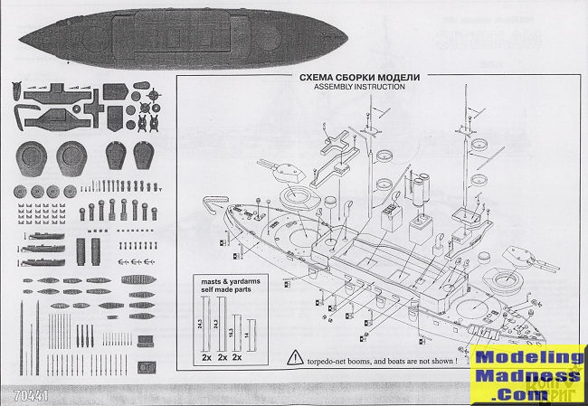 As you can see, instructions are an exploded view that shows where everything fits. The other side of the instruction sheet has a side and upper view, something that will help not only in getting the bits in the right place, but also mandatory when it comes to rigging this one. There are a LOT of rigging wires to attach. You'll also need the upper surface view to figure where to put the ship's boats.