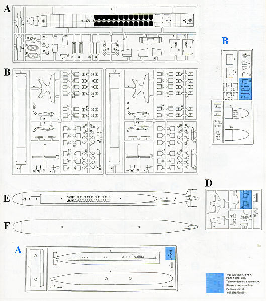 Instructions are typical of this series, printed on slick paper with all of the well-drawn construction drawings on a single folded section of paper. Color information is provided by Gunze and Model Master references. Both submarines are a dark metallic grey on the upper surface with hull red areas below the water line. Decals are provided for both and this includes the first nose art I've seen on a sub with the USS Chicago having a large bull on the very front of the boat.