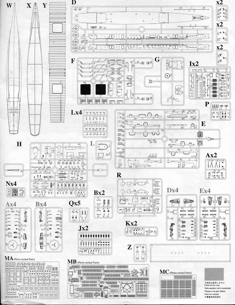 Dragon Models has one again provided the ship enthusiast with a superb kit. Totaling over 1300 parts, this is by no means a quick build, however, many of the parts total comes from duplicate sprues for things like guns, rafts, aircraft and other multiple items. I was particularly impressed that the aircraft were segregated by a cardboard wall from the rest of the kit. The major hull pieces and deck were also well protected in a form-fitting clear vacuformed tray to keep them from being loose in the box and damaging other sprues.