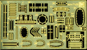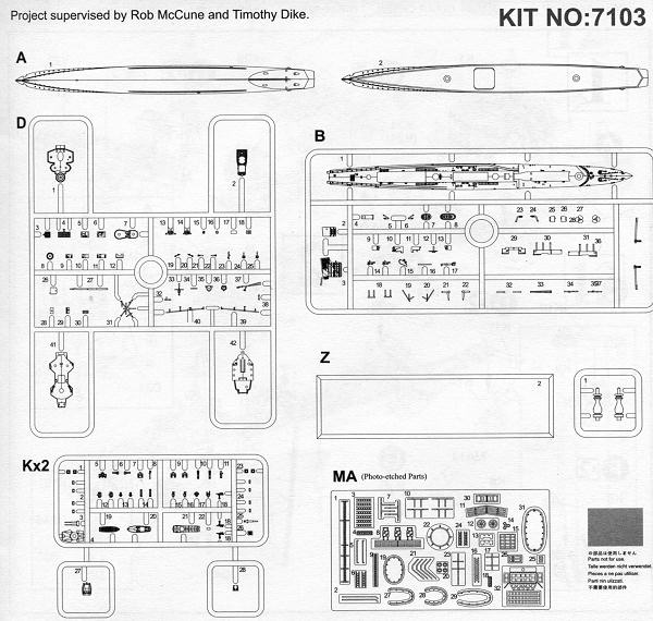 Since the 1/350 kit was released six months ago, it has been selling very well for Dragon so it is natural that they would release this in 1/700 scale. It is an all new tool kit that is superbly detailed and contains 120 pieces, some of them on the nicely done etched fret. This fret has amongst its parts, bits for the funnels, radar antenna and several ladders. Th
