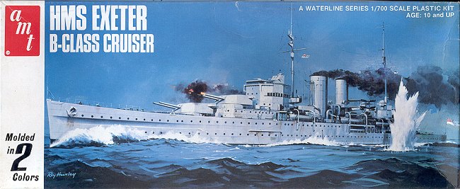 HMS Exeter was one of several 8" gun heavy cruisersbuilt after the first world war. Newer British cruisers of the mid-wars wentwith the lighter and faster-firing 6" guns, leaving the bigger guns on theolder ships. During the opening days of World War II, the Exeter was one of several ships sent down to the South Atlantic to find the Germanpocket battleship Graf Spee. After getting close to her, the force,consisting the cruisers Ajax, Achilles, and Exeter, spotted the GrafSpee heading for Montevideo, Uruguay for reprovisioning and to let offcaptives. A fierce gun battle ensued, damaging some of the British cruisers,including the Exeter, which basically lost the forward turret. TheBritish ships broke off to prevent thier total decimation as the Graf Speeheaded for South America. As you know, the British succeeded in fooling theGerman captain into thinking there was a large force of ships awaiting him ininternational waters so he scuttled the Graf Spee rather than lose her inbattle.