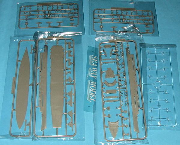 small parts. A clear sprue provides aircraft and includes four each of Zeros, Vals, Kates, and Jills. It appears from the instructions and only the Zeros and Kates are to be used. As usual with these waterline ships, a hefty weight is also provided.