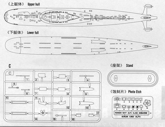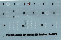 Typical of modern submarines, the Hobby Boss kit does not have a lot of parts. There are upper and lower hull sections that will require care in assembling to minimize the seam between the two. The horizontal stabs are molded in the top of the hull as is the conning tower as such. On the underside are two water inlet scoops and the lower fin and rudder. The upper fin also has a separate rudder and the 'elevators' are separate items as well.