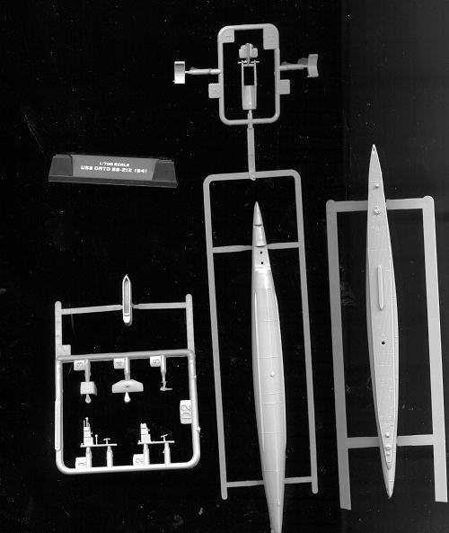 The rest of the kit includes a lower hull sprue (marked 'Balao'), that includes the one piece rudder/aft diving planes/props section. There is some flash that will need cleaned and a mold line along the bottom of the hull that also has some stubs on it. The upper hull is also a single piece and is rather nicely done. It suffers from a few small sunken areas near the bow. The other sprue has your optional pieces. You can model the kit as 'surface' or 'diving'. The surface one has dive planes up against the bow with all the antennas sticking out of the conning tower. These two bits have alternate 'diving' modes with the dive planes sticking out and all the antennas retracted. Both of the conning tower bits have flash on the small pieces. So, if one removes the three parts of the stand and the two optional bits that won't be used one has an eight piece model. No AMS on this one!
