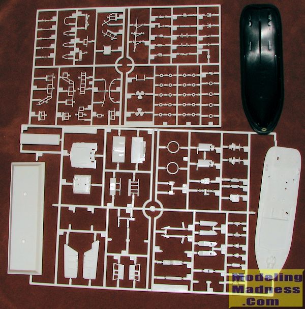 This was another sale table kit as the original owner had filled the sink area on the bottom of the hull. The kit is molded in white plastic save for the hull which is in black. This is a full hull kit and comes with a nice base with small supports on which the finished model is placed.