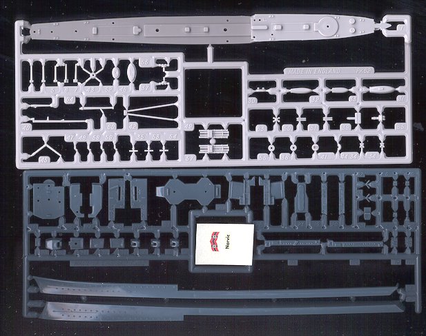 Parts are molded in dark grey and light grey. No flash or pesky ejector pin marks, but typical of Matchbox kits, there are sink areas in areas of thick plastic (like the boats) or opposite alignment pins. All detail is of the raised variety. A bit of work with a pin vise to open up the hull portholes will improve things. The hull is two sides with a single deck. Thanks to the closed bottom on each hull half, warping won't be a problem as it is on some of the larger Matchbox kits. Care will be needed when removing the very small parts as there is little room between them and the sprue attachment points.