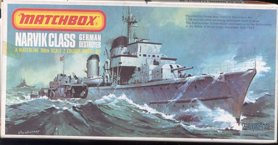 Instructions are typical Matchbox providing pictorial construction steps. There is no detail color information with the ship apparently being overall light grey with back funnel tops. Humbrol and generic names are given for the paints. Only a German Naval Ensign is provided for decals.