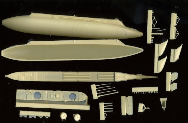 Pavla's kit is a full resin construction with no deals. The hull comprises two halves on which a flat deck section is attached. My halves were of a slightly different length, but nothing that can't be fixed with a bit of filler or sanding. Other largeish pieces are the upper deck section, Fins for the rear along with the rudders and two hatches. There are also a myriad of fittings and guards, all finely done in resin. The builder will need to stretch sprue or cut wire for the ladder type construct near the front. Overall the resin is very nicely formed and though there is a bit of flash, it is fine stuff and easily removed.