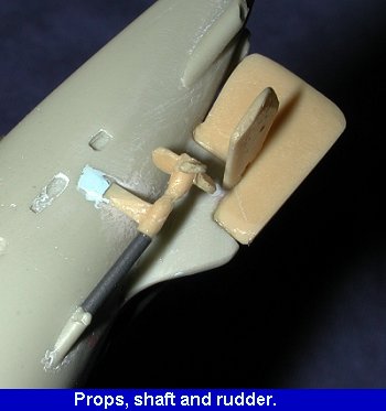 Towards the rear the props,prop shaft, shaft mounts, rudder and rear planes have to be glued on. The rudderand rear planes are in good shape and clean up well. The shaft mounts and propsare not and take a lot of work. The prop shafts themselves need to be made fromplastic rod that is enclosed in the kit.