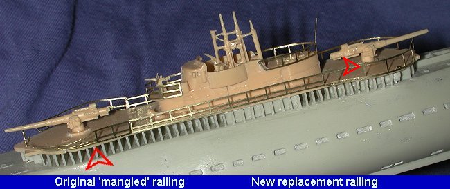 It had now beennearly 11 months since starting on the kit. I was determined to finish the darn thing!This meant finishing up the railing problem and fixing the stabilizers as wellas putting on the last few bits of etched brass, painting the kit and building amount for it. Piece of cake! First thing was the forward railing. I used some'spare' railing and simply glued it in place. This is the way the originalpieces should have fit. No hassles.