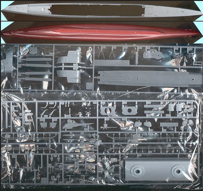 It is molded in darkgrey plastic with the exception of the lower hull which is molded in red. Whilenot designed as a waterline kit, it seems from looking at it that if one did notinstall the lower hull that it would be darn close to the right height. One isgiven the wiring and switches for motorizing the kit, but not the battery orelectric motor which is obviously an extra. You even get five tiny crewmen tostand watch on the bridge!