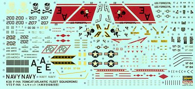 schemeis from VF-31 with the big red tail bands and black radome. Finally, VF-102 isthe sole version with the smaller grey insignia as is now so typical with TPSpainted Tomcats. The sheet provides not only things like wing walk andinstrument panels, but also a zillion data stencils that are sure to keep youbusy for quite a while applying them! Typical of Hasegawa kit decals, these area bit thick and should be applied using hot water for best performance.