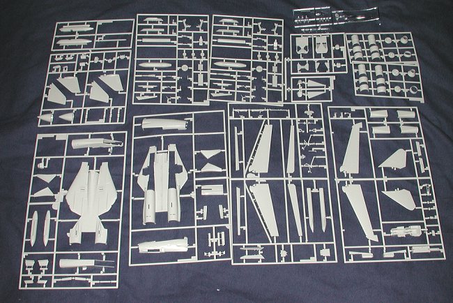 Ithas all the goodies that were considered necessary at the time. There areoptions to allow a multitude of variants of the F-14A. Along with that are aplethora of parts, many of them rather small, but such is the case with modernkits. There are so many parts that the box is actually bulging in an attempt tokeep them from escaping. You can see the number of bits and pieces from theimage above. In many ways, this is just a smaller version of the larger andequally impressive 1/48 F-14 that Hasegawa has produced. Typical of Hasegawa,the kit came with all those sprues in two bags. As a result, there were a numberof parts broken off the sprues and the bits have numerous scratches on them.