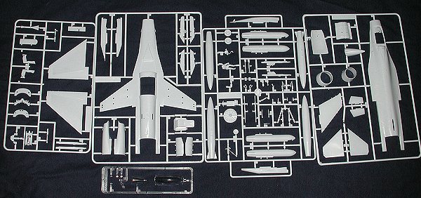 First thing you notice is that though the box art shows an A model, you can do either as the lower fin section for both are included. What you do find is pretty much a clone of the Hasegawa 1/48 F-16 kit. The only other part I see that I don't remember from the Hasegawa kit are the two GE gun pods. These pods never made operational service (that I can remember) so are pretty well to be tossed.