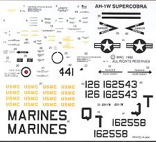 This helo is attached to HMT-303 and coded QT. Theother is from an unknown unit from Desert Storm and painted in tan and browndesert camouflage. This particular bird has only a serial and nose numberwith all other markings painted over. Today's 'Whiskey' Cobras are painted intwo colors of air superiority grey and look just as drab as any other militaryaircraft. The decal sheet is small but sufficient and in register.