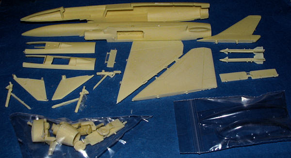 As you may expect, I found some of the usual molding flaws in terms of air pockets on the wing tips, afterburner and fuselage, but these are all easily fixed as will be the chunk on the inner portion of one of the canards, produced when the pour stub broke away. The interior consists of two seats and one control stick for the front seat. Wing tip missiles are molded on with the rails and mine managed to arrive completely intact with no broken fins. This is undoubtedly due to the packaging and the use of a stronger plastic for the compartmentalized bag.