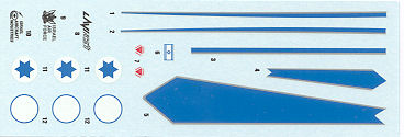 Instructions are the usual with a short history, photo, parts list and exploded view on one side. The other has a two view for painting and decals. Basically this is a white aircraft with blue parts provided as decals. There are two identical decal sheets given for the insignia and the stripes. These are for the first two prototypes, which seem to not be differentiated in terms of markings. The box art photo shows the Technology Demonstrator which does away with the canard leading edge bits. You may also note that the wingtip missiles are angled down in the photo and may well consider modifying your kit to match. Decals are very nicely done and in perfect register.