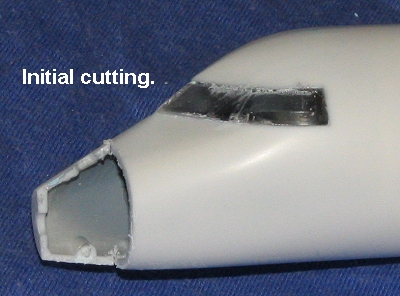 In order to have the nose conversion work, the kit nose has to be cut off. The decal instructions show you exactly where you have to make the cut. As I rarely get these things right the first time, I cut mine a tad shallower than what was shown. The theory being that I could sand back the nose until it matched the resin part. This part had