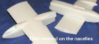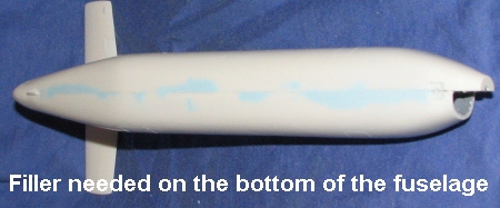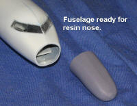 Once the nose was cut off, it took a bit of care to sand back the nose until the opening was a pretty good match. Then I glued on the new resin nose. Fit wasn't bad, though I got it a bit off kilter so I had to do a bit of adjusting. Actually, I had to break it off as I forgot to put weight in the nose! Fortunately, it was a clean break so after inserting several large fishing weights, I reglued the nose into position. While that was drying, I glued on the wings. These needed a bit of trimming to the receptacle slots i