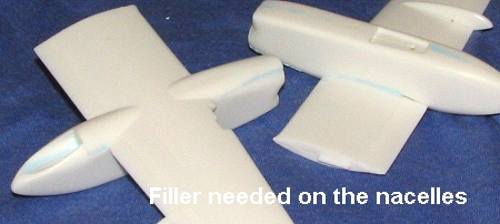 Though it seems like a simple kit, if you have built a Hobbycraft kit, you know that rarely does it fall together. It is just something that we have come to expect over the years so we are not really surprised when we have to do a bit of work. First thing was to build up the various sub assemblies. Basically, this meant the wings, nacelles and interior. Fit on all these parts is fair. The interior parts are basically invisible once you get the windscreen parts installed, so spending a lot of detail time on this part is a bit of a waste. Regardless, I painted the interior Dark Gull Grey with Voodoo Grey seats. The anti-glare panel was in Black as were the control stick handles. Again, you can't see it once it is in place; a good thing as the fit of the anti-glare panel is not good. It just sort of glues 'somewhere' atop the instrument panel.