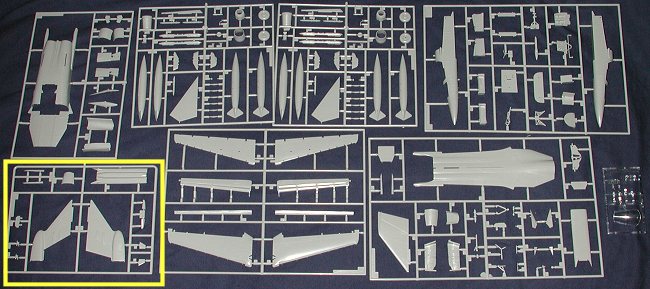 The EF-111 kit has many extra parts left over from the F-111A boxing, but has a unique sprue (marked above in yellow). If you really wanted, you could build an F-111A from this kit as all the right parts are provided, just no decals. There are even those neat long range fuel tanks that you can rob and use on your next 1/72 A-10 (as I think they are the same). Probably the only down side to this kit is that it is not designed to be displayed with the wings swept back. This would require some surgery to have the flaps and slats in the up position. I've never seen one of these built in that way so it must be a bit of a chore to do properly.