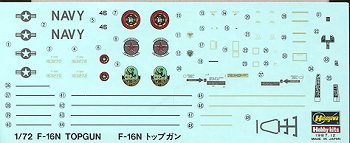 Decals are givenfor two aircraft, one from Top Gun and the other being the ceremonial scheme forthe first aircraft delivered. They are in-house Hasegawa decals so are a bitthick, but should work ok as long as you don't use setting solution on it. Myluck with setting solution and Hasegawa, Fujimi or Tamiya decals is not good,that is why the recommendation that you don't use them.