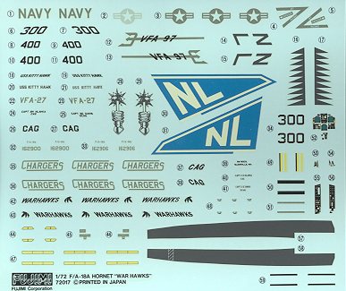 nstructionsare very good giving ten construction steps. Color callouts using Gunze paintsare given for all steps. The decal sheet offers two aircraft, one from VFA-97and another from VFA-27. These two squadrons from the Kitty Hawk before she wentto Japan, were the last two to fly the F-18A in Fleet service. Decals are quitecomplete and though for CAG birds are not that colorful as CAG birds were in thepast. If using the kit decals, make sure that you use warm water to get them offthe backing sheet and do not use any setting solution on them. The warm watermakes them pliable enough to snuggle down nicely.