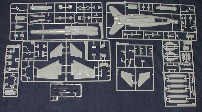 The rest of the kit is the same as it has been foryears. Panel lines are engraved and the cockpit is relatively complete withseat, stick and instrument panel. Again, instruments for the panel and consolesare provided in decal form. There is a two piece canopy that can be displayedopen or closed as you desire. A boarding ladder is include should you wish toinstall it. underfuselage stores are either the twin sensor pods or Sparrowmissiles and a centerline fuel tank. For an F-18D you'll want to install thepods. Underwing you have four hardpoints. The inner ones carry fuel tanks andthe outer ones are bomb racks. No bombs are supplied, so you'll have to buy theweapons set for these or get them from another source.