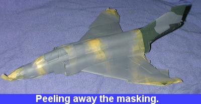 Next, I masked off the Dark Sea Grey around the aft end of the airframe and on the tail planes. Then I used several shades of Alclad II to get the proper metallic look to this area that I wanted. Among the colors used was jet exhaust, magnesium, aluminum, and steel. Once that was done, I painted the area under the upper inlet doors black. Then I spent a few days going back and fixing several of the painting glitches that is pretty well standard with this kind of a paint scheme. Taking off all that masking took but a fraction of the time it did to apply it. With all that finally done, I returned to the work bench to add on some more bits prior to tackling the decals.