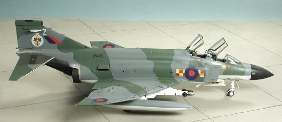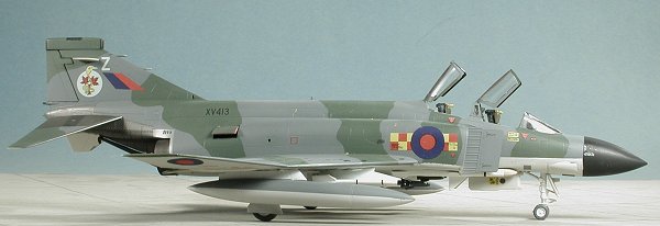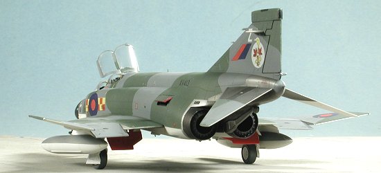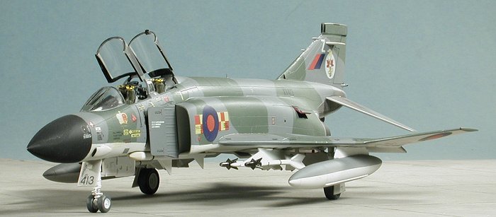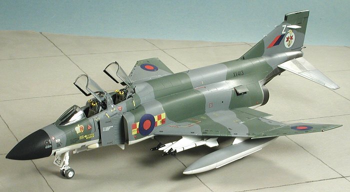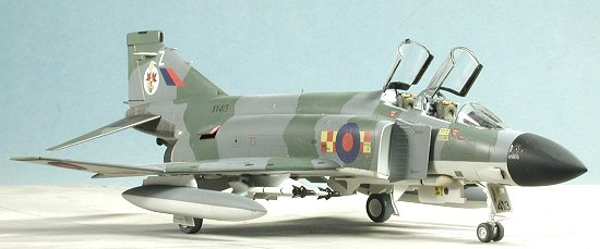 Diving right in to the kit, the first thing I did was to put in the little plugs for the FG.1 in the lower wing and open the holes for the drop tanks and missile pylons. I then assembled the drop tanks and the centerline gun that is provided. It really isn't that great a gun, but makes for something a bit different. The major parts of the interior were glued together and then painted dark gull grey along with the inner fuselage walls. Detail on the instrument panel and consoles was picked out in black and a few colors then drybrushed with a lighter grey to bring out detail. I then glued the interior to the fuselage section and then glued the wings. Fit is really quite good, though I had some filler needed for all the join areas. This is not a kit problem, but mine. About this time, I decided that I really wanted to do an FGR.2. Having already put the catapult attachment plugs in, it meant that I had to fill those areas. It also means that I'll be using the non-slatted tail planes as that is really one of the biggest visual differences between the two versions. With the wings attached, the intakes were glued together and then glued in place. They were painted white prior to assembly and the back part painted flat black. None of the Fujimi kits gives any kind of engine compressor faces nor do they offer full intake trunking. Not really that big a problem for most of us, but some want this option. I'm not sure if Seamless Suckers offers anything for the 1/72 kit or not. Perhaps a reader will know. Now usually the intakes are the poorest fitting part of a Phantom, at least for me. This was no exception, though the amount of filler needed to smooth things out was a lot less than on previous kits. Perhaps I'm starting to get the hang of it after 50 some F-4 models! At this time, I installed the canopy pieces and masked them. The flaps were pressed into the slots in the wing and the first round of painting was started. CAMOUFLAGE This was to be an older scheme from 1977 with the green/dark grey uppers and light grey under. First thing I did was to spray the nose a gloss black. When it was dry and masked, I did the underside color, Light Aircraft Grey. I used Xtracolor because I had some and I like the paint. While that was drying, I painted a lot of white parts such as the landing gear, inner door panels and pylons. The lower edges were masked and the upper surface painted Dark Green, again with Xtracolor paint. The upper surfaces wrap around slightly on the leading edges of the wing so much of the lower wing was masked to prevent any overspray. Then a ton of masking tape was used and the green areas were masked in preparation for the next color, Dark Sea Grey. I didn't have any Xtracolor for this so used some Testors Model Master enamel instead. During this time, the missiles were all painted white and the tips of them painted black for the Sidewinders and buff for the Sparrows. I also masked off the drop tank pylons (they are part of the tank construct) and sprayed the bottom of the tanks Light Aircraft Grey. I also sprayed the inside of the speed brakes red. The afterburners had been assembled and these were painted Burnt Iron using Testors Metallizer. BACK FOR MORE CONSTRUCTION As is normal for me, at this stage, the landing gear was glued in place. This is as much to allow the plane to stand on its own while the decals are applied as for any other reason. The gear wells had been painted white prior to this. Some say Light Aircraft Grey, but I'm not so sure. These planes were made in St. Louis so would have had the same wheel well colors as any other F-4 that came from that production line; and that color is white. DECALS I used Modeldecal sheet #64 for this aircraft and chose the only green/grey Phantom on it. This was a 92 Squadron plane from the Jubilee of 1977. As it typical of modern aircraft, it has a zillion small decals to apply. You know, it is this plethora of data decals as well as all the fuss one has to do with things under wings that is probably the reason I don't do that many modern aircraft. Applying the decals took nearly a week to do because there are so many of them. Modeldecals are not the thinnest in the world, but they do stick very well and don't require any setting solution. Just pat them down with a clean rag and they are there for life! Once all the decals were on, I recoated the plane with gloss clear, followed by a coat of matte clear. FINAL BITS