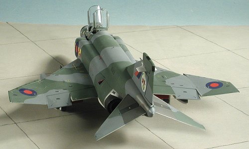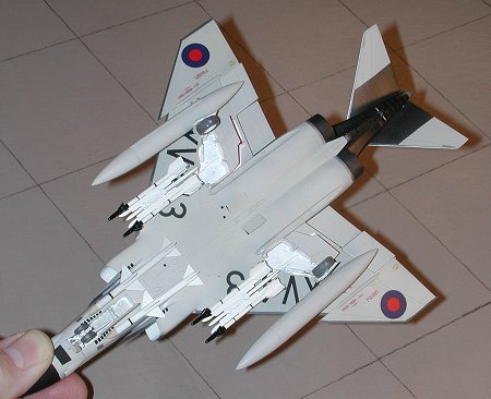 With modern aircraft there are more final bits than most planes. In this case it consisted of installing the nose gear doors (BTW, the forward nose door is NOT correct for a British Phantom; mostly because the lights are in the wrong place), the drop tanks, assembling and painting the missile rails and missiles, then gluing them in place. About this time, I noticed that something wasn't quite right. It was the fin mounted blade antennas. I had forgotten to open the hole for them way back at the initial construction phases. Well the plane needs them so I had no choice but to cut them and carefully glue them to the fin. That's what I get for not paying attention. Then there is the touch-up painting that invariably needs done. I then removed the canopy masks, installed the kit bang seats and glued the canopies in the open position. Finally, I hurried to the photo area to take pictures before I broke something!