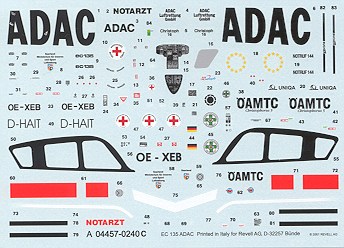 Instructions are the semi-newsprint version that opens on the top rather than the side. Colors are all in Revell shades, some mixing is required for some of them. Fortunately, a generic name is given so we at least have some idea of what to paint it. It is quite a disturbing trend for model companies to only give references for their own brands, especially as some of these paints are not available everywhere. Markings are for two Auto Club helicopters, both in overall yellow with black trim. One is for the German Auto Club as is shown on the box art. The other is an Austrian Auto Club EC-135 and will have the red/white/red of their flag on the fin. The decals are well printed and quite matte. They include instrument panel decals and some of the black and dayglow red trim so that won't have to be painted.