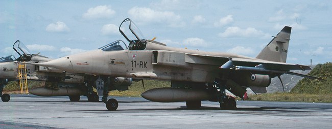 The RAF received 200 Jaguars, comprising 165 single-seat GR.Mk Is (with chisel laser noses) and 35 T.Mk 2 trainers. The latter have the full nav/attack avionics suite but no lasers. Delivered in 1973-78, GR.Mk ls were tasked with nuclear strike, reconnaissance and conventional strike. Recce aircraft carry a centerline pod containing five cam-eras and an IR linescan. The GR.Mk 1A upgrade added a FIN1064 INS, AN/AILE-40 flare dispensers, Phimat flare pods and jamming pods to 75 single-seaters. Fourteen trainers were similarly upgraded as T.Mk 2As. For Operation Granby in 1991 Jaguars also used CRV-7 rockets and CBU-87 cluster bombs.