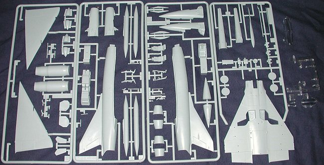 Well, that won't be a problem with this kit as it has been designed to be built as either a single or twin seat aircraft. This is done by supplying a new nose section that on the trainer, has a separate nose cone. This is built in on the interceptor. This means two seams that will have to be filled. The upper fuselage spine is also a separate piece. The intakes are different for the two types and those are also supplied. Considering that most of the twin-seaters were in natural metal, it will be a real challenge to build this as such. Though you might expect a lot of under wing armament, the truth is that only the thin 'supersonic' fuel tanks are supplied.