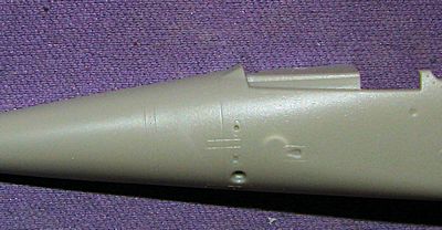 Once the engine was built up and the main gear wells installed, the rear fuselage halves were cemented together. Moving back to the fin, the two sensors were installed just above the rudder and in the center of the forward fin. Both of these are thinner than the area into which they fit.