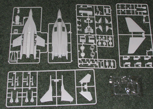 This one is molded in a white plastic to make it easier to paint. Previous boxings have been in the standard grey plastic. The overall molding and general detail is very good with crisply engraved panel lines. The cockpit tub provides engraved detail on the consoles and instrument panel along with decals. A nice, single piece seat is provided, though you may wish to substitute it with a more detailed aftermarket version. A pilot figure also comes with the kit.