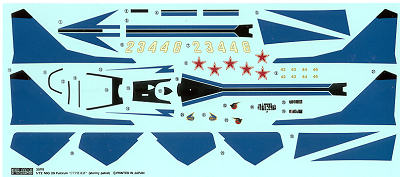 Instructions are well done with the usual Gunze paint references. Markings are for any one of the four 'Stormy Petrel' display aircraft. All of the blue markings are provided as decals. Some of you may well wish to paint some of the larger sections and use the decals only for the more difficult detail stuff. I would definitely paint the fins and tail planes. Fujimi uses typical Japanese decals, which means that they may not like setting solutions. Generally, using very hot water is the way to get these to work the best.