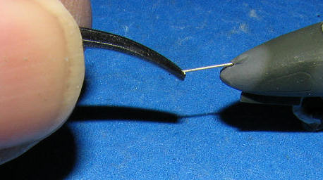 With that done, I then drilled out a hole in the nose for the pitot tube. Using Griffon Models tiny .3mm brass tubing, I cut a small section and installed it in the hole. It was then painted silver. The tape was removed from the canopy and that was it.