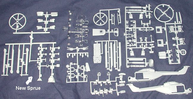 Upon opening the box, one is presented with an old friend and a new sprue. Interestingly, the old kit parts are in an unsealed bag while the new sprue is sealed! The new sprue includes a new rotor system, new sponsons, and new noses as well as a few more antennas and fuselage mounted sensors. The quality of the new sprue is about the same as the kit itself so should blend in well. No engraved panel lines on the new bits! :o)