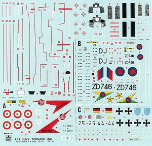 I've mentioned how good ESCI instruction sheets are and this one is no exception. There are markings for three aircraft. One 6 Stormo Tornado with the unit's nice red tail chevron, a 31 SQ RAF bird with its yellow and green chevron, and a JBG 38 Tornado in the initial German paint scheme. Full wing walk decals are also included. An added bit for this particular kit is a sprue of soft plastic ground crewmen for the diorama folks.