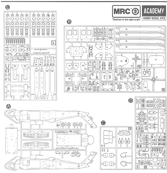 Molded in light grey plastic, there are four very large sprues and one smaller clear sprue that are individually packaged to prevent damage. I'd have the usual photo for you, but the parts are quite large, the fuselage alone measuring nearly a foot and a half in length. You get all the proper options including the external pylons and fuel tanks, a complete port engine that can be displayed, cabin machine guns, and optional position gun and cabin doors. Cockpit and cabin detail are very good and complete. The rotor head assembly is quite complex looking and most convincing.