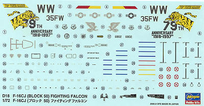 Instructions are typical of Hasegawa and very well done. Color references are for Gunze paints with FS numbers also provided. The markings are for two aircraft. Both are listed as Block 50 types. One is the box art aircraft from the 79th FS at Shaw AFB in 1997 for the Tiger Meet. The other is a boss bird from the 35 FW at Misawa. Both are shown in the three greys scheme. Decals are well printed and include a full stencil suite. They seem to be the 'standard' Japanese type that do not like setting solutions so be sure to use very hot water when applying them.