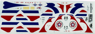 The instructions are quite well done with four construction sequences and colors called out in generic or FS 595 numbers. The instructions state that the interior is FS 36270 Neutral Grey, though I do believe that FS 36231 Dark Gull Grey is more appropriate. Markings for one of the pre-production aircraft in a striking Thunderbirds-like Bicentennial scheme. The Scalemaster decals are well done, but like most of the markings from this company, the red has bled into the clear surround, meaning that if one wants to use them, each red section will have to be carefully cut out. It is assumed that one will paint the airframe white so no white markings are given. The bleeding problem also makes all the data markings unusable. Aftermarket will be the only way to go.