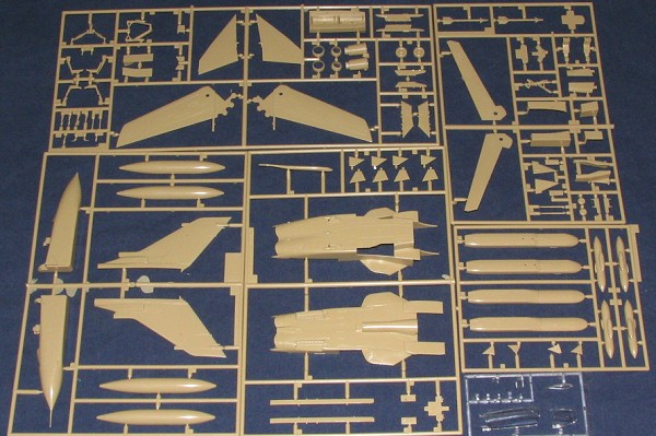 Wheel bays are separate and somewhat devoid of any detailing aside from some bracing. I know that there are hydraulic lines and electrical conduits that snake their way through. The wings are designed to be able to be swung forward or aft, and the builder will need to drill out mounting holes for the pylons on the lower wings as well as on the lower fuselage section. Unlike the F-111 kits, there are no droppable flaps or slats on this one. This type of aircraft invariably means an aft fuselage split horizontally to trap the wings and the forward fuselage split vertically. No requirement for nose weight is offered, but you may wish to add some just in case.