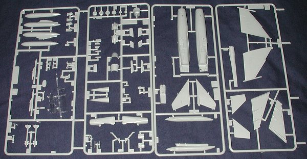 There are four rather large sprues of light grey plastic and a small one of clear for the two-piece canopy. This is an early 80s kit so has raised panel lines. Parts are well molded, though most of them suffer from ejector pin marks. In most cases they are in places that can be easily removed, but some with take a bit of effort. Like I said, an early 80's kit. There are also a few sink marks on some of the thicker parts like the bang seat (which is a bit basic and should be replaced if are so inclined).