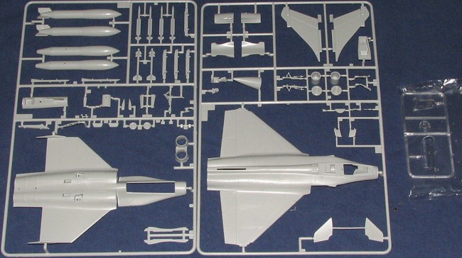 The two sprues that come loose in the box are very well molded. Transparencies are in their own bag. On my never ending quest for ejector pin marks or sink areas, or flash, I did find some of the first two. Ejector pin marks are on the inside of the main gear doors, on all the pylons and on all the missiles. Sink areas are on the upper wing where the outer portion of the lower wing attaches.