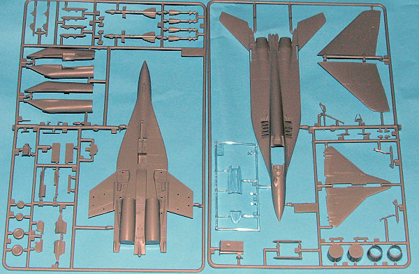 This kit comes on three sprues, one of them holding a two-piece canopy. The other have nicely engraved detailing, though not quite as crisp as what one finds on the Fujimi or Hasegawa MiG-29 kit. I also suspect that this kit is more accurate than those two, for the Japanese companies were in a rush to get theirs on the shelves and were unable to make accurate measurements of the real aircraft. The date on the box side is 1994.