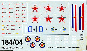 Instructions are very well done and provide full painting information in generic, Model Master and FS 595 references. A small but well done decal sheet gives markings for two aircraft. Both of these carry different camo schemes. The Russian aircraft is pale green over light gull grey, while the Yugoslav aircraft is light ghost grey over light gull grey. I'm sure the colors are approximate. The Yugoslav painting and decal guide is in full color on the back of the box.