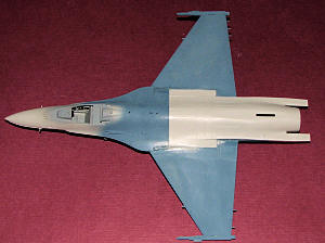 Decided at this time to paint the exhaust sections, using Alclad II Jet Exhaust. During this time, I prepainted the wings, stabs and part of the fuselage with Intermediate Blue. Not having access to Gunze paints, I used a conversion chart to find the closest Testors paint and that is what it came up with. Glued on the forward fuselage section, which is a very snug and pretty good fit. The LEREX wraps around on the upper section and while there is a bit of a gap on the underside, I decided it would be more work to fill than it was worth. The wings were then glued on. Fit is quite good, but again, there is a bit of a gap. This time, I did fill it as these are supposed to be seamlessly smooth transitions from fuselage to wing.